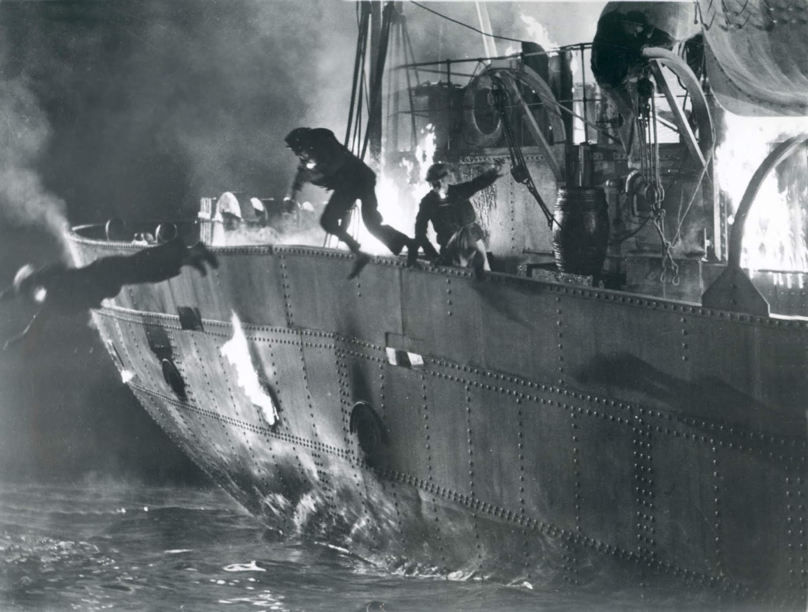 También será sencillo el recurso de repetir los gritos de la tripulación en la escena posterior. Ya a bordo de un nuevo barco, el oficial al mando, cuando está solo a bordo a punto de embarcarse en nuevas aventuras escuchará con horror los gritos de la tripulación perdida. Es un recurso facilón para mostrar el desgaste de la guerra. El protagonista se imagina a su anterior tripulación en el último momento en el cuál les escuchó. En cierta manera, es como si nos quiseran mostrar que esos pobres diablos estarán ahí, a bordo de este nuevo buque de guerra, pues siempre estarán en la mente del protagonista.